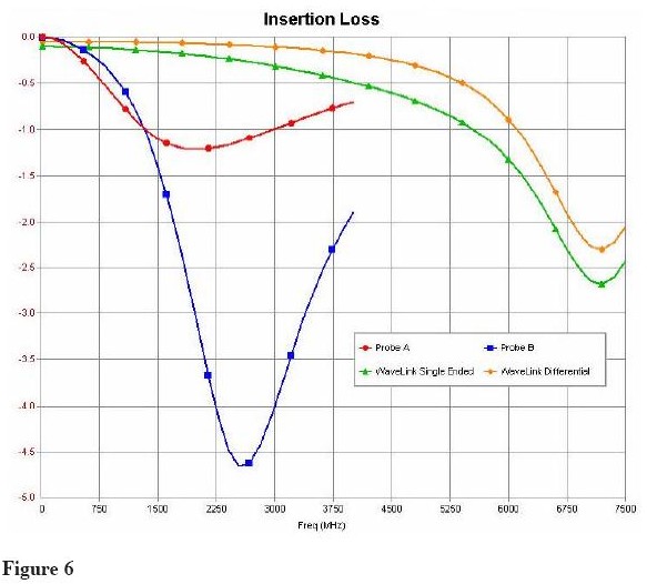 為了比較差分探頭的性能,通常在良好定義和常數(shù)電路中畫出負(fù)載效應(yīng)。比如,每個探頭在50歐姆理想環(huán)境中產(chǎn)生的插損如Figure 6所示。插損用dB表示;作為電壓表示,必須除以20,采用反對數(shù)。比如Probe B導(dǎo)致的4.6dB的插損會產(chǎn)生41%的幅度損失。這對于被探測的信號有顯著影響。