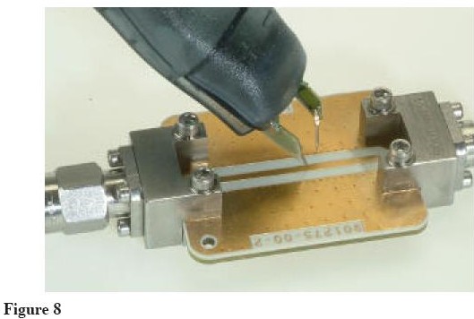 決定信號的探頭負(fù)載效應(yīng)是很難的。最簡單的方法是通過可以探測信號的夾具連接信號(或者典型信號)到測量儀器的輸入。這樣的夾具如下圖(Figure 8)所示。這是一個50歐姆微帶傳輸線,提供到儀器的極低失真連接。使用這個夾具,可以測量信號在探頭連接或不連接情況下檢測信號形狀的任何變化或由負(fù)載效應(yīng)導(dǎo)致的時序。