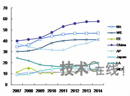 2010年中國的電視市場規(guī)模將達(dá)到4800萬臺,按供貨量計(jì)算,規(guī)模為全球最大。其他新興市場國家的需求2010年也將開始恢復(fù)。到2014年,亞太地區(qū)的電視供貨量將超過西歐,新興市場國家將推動全球電視市場擴(kuò)大。