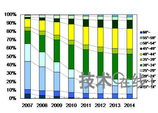 40英寸以上的電視在整體中所占的比例預(yù)計(jì)2010年會超過30%。2013年會達(dá)到40%,之后將基本飽和。分地區(qū)來看,中國正在追趕在電視大型化方面領(lǐng)先的北美和西歐,從這一點(diǎn)來看,中國的影響力會擴(kuò)大。
