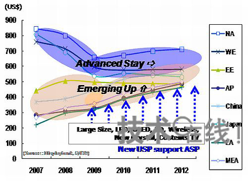 分地區(qū)看電視的平均銷售價(jià)格(ASP)變化可預(yù)測,發(fā)達(dá)國家市場的ASP暴跌將告一段落,而在新興市場國家,隨著FPD電視的增加和屏幕大型化,ASP將會繼續(xù)上漲。另外,估計(jì)LED背照燈液晶電視、3D電視、IPTV及無線功能等的普及也會成為推高ASP的因素。