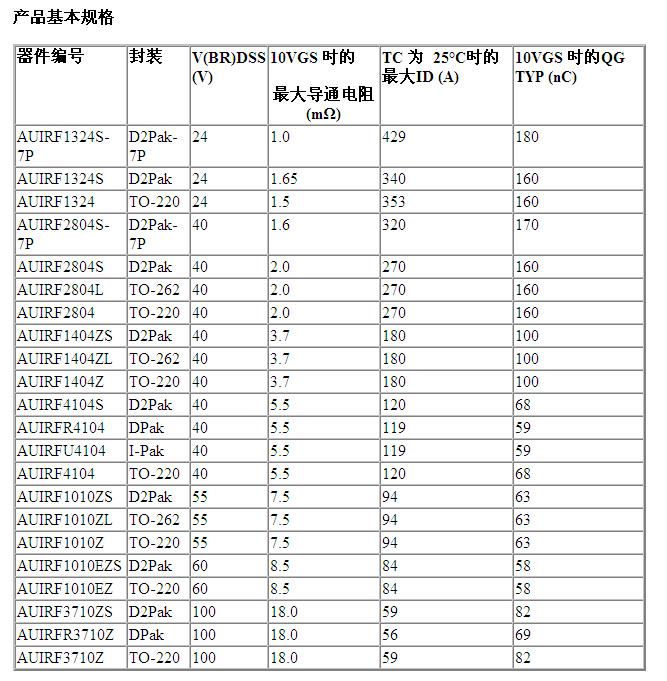 IR 亞洲區(qū)銷(xiāo)售副總裁潘大偉表示:“IR 這些經(jīng)過(guò)優(yōu)化的汽車(chē)專(zhuān)用MOSFET具有低導(dǎo)通電阻,具有寬泛的電壓和封裝。由于其表面形成了鈍化層,因而可以提高可靠性。此外,該器件的材料經(jīng)過(guò)調(diào)整、優(yōu)化后可達(dá)到堅(jiān)固、耐用的效果。”