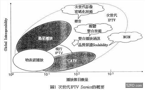 次世代IPTV服務針對各影像傳送服務,擴大高品質(從SDTV一直到HDTV)與擴大數量龐大的節目服務區(servicearea)管理,對多數加入者提供更經濟的節目傳輸效益(圖1)。