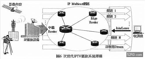 圖6是次世代IPTV播放系統架構,如圖所示IPTV播放系統透過送出設備的IPMulticast傳送節目,收訊機端消費者的選臺操作,可以使該傳輸該節目的MulticastStream收訊再生。