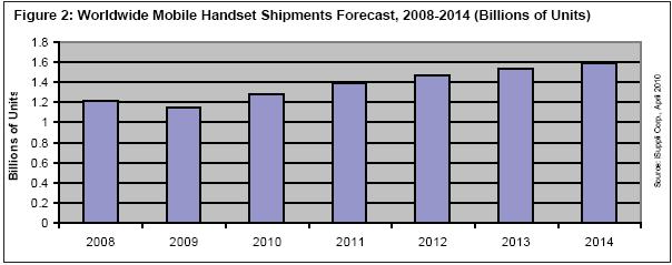 圖2所示為iSuppli公司對2008-2014年全球手機(jī)出貨量的預(yù)估。