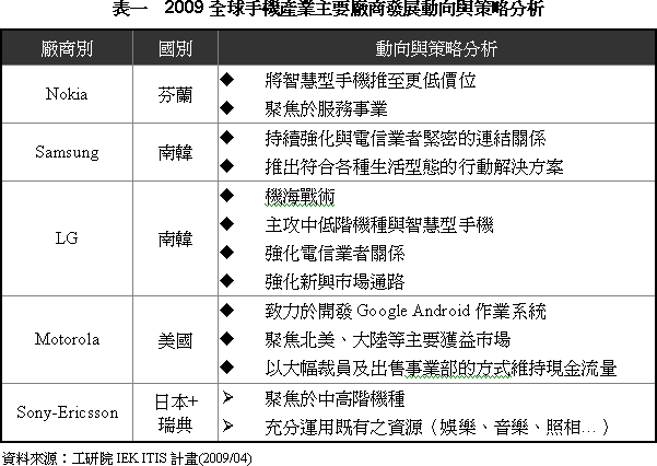 受金融風暴影響,2009年全球手機市場衰退已成定局,為了因應詭譎多變的局勢,前五大手機品牌業者紛紛調整其市場策略,Nokia以完整布局求穩定發展,Motorola與Sony-Ercisson則主要以撙節開銷的方式熬過寒冬,相較之下韓系業者則以較為積極的方式進行布局。