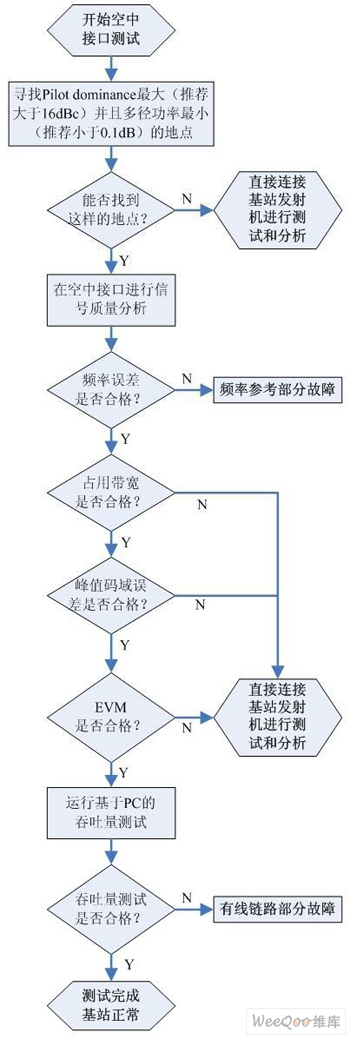 基于方便合理的原則,應首先使用空中接口測量方式在合適的地點檢查基站發(fā)射機的信號覆蓋和信號質(zhì)量,爭取在空口測試中對基站狀態(tài)做出準確判斷。如難以判斷空口測量結(jié)果或需要精確測量發(fā)射功率,則需要直接連接基站進行測試。測試步驟如圖2所示。