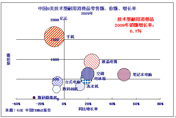 - 2009年中國技術型耐用消費品零售總額8442億元,比08年增長6.7%