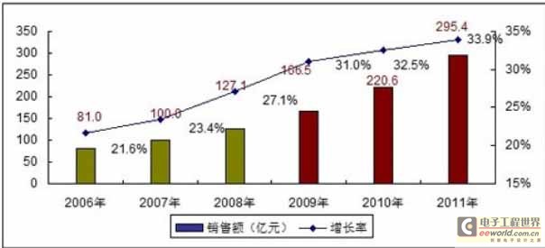 圖1 2006-2011年中國便攜醫(yī)療電子市場規(guī)模與預測