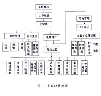 該無線電力負荷控制系統的管理軟件是用面向對象的編程工具VisualBasic6.0開發完成的,系統軟件框圖如圖3所示。系統啟動后要求輸入操作員工號及口令,驗證無誤后連接電臺,進入主窗體。