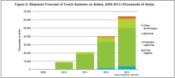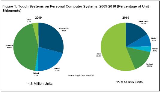最近幾年,個人電腦市場對于觸摸屏的需求不斷增長,2008和2009年增長率超過20%,快于總體系統(tǒng)市場。但與該市場2010年462%的增長率相比,上述增長速度就相形見絀了。平板觸摸電腦是PC觸摸革命中的主要初期推動者,預(yù)計(jì)占PC觸摸市場的比例將從2009年的3.8%銳升到56.2%,而總體PC觸摸市場規(guī)模將擴(kuò)大兩倍。