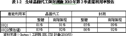 在IC制造業(yè)部分,預(yù)估2010Q2漸步入季節(jié)性需求上升期,配合產(chǎn)能逐步開(kāi)出,臺(tái)灣IC制造業(yè)可望呈現(xiàn)價(jià)量齊揚(yáng)的階段,帶動(dòng)臺(tái)灣IC制造業(yè)產(chǎn)值上揚(yáng),預(yù)估可較2010Q1成長(zhǎng)6.6%,并較去年同期成長(zhǎng)47.6%