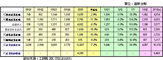 IEK ITIS計(jì)劃預(yù)估2010年臺(tái)灣IC產(chǎn)業(yè)產(chǎn)值達(dá)16,374億元,較2009年成長(zhǎng)31.0%,優(yōu)于全球半導(dǎo)體之成長(zhǎng)率。其中設(shè)計(jì)業(yè)產(chǎn)值為4,354億新臺(tái)幣,較2009年成長(zhǎng)12.8%;制造業(yè)為8,083億新臺(tái)幣,較2009年成長(zhǎng)40.2%;封裝業(yè)為2,720億新臺(tái)幣,較2009年成長(zhǎng)36.3%;測(cè)試業(yè)為1,217億新臺(tái)幣,較2009年成長(zhǎng)38.9%。而在附加價(jià)值部份,預(yù)估2010年臺(tái)灣IC產(chǎn)業(yè)附加價(jià)值為6,468億元,較2009年成長(zhǎng)47.0%。