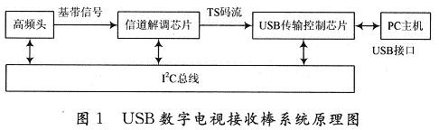 USB數(shù)字電視接收棒系統(tǒng)主要有以下4個(gè)模塊構(gòu)成,如圖1為系統(tǒng)的原理圖。