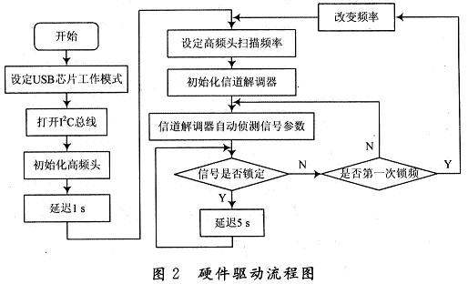 硬件驅(qū)動(dòng)程序是系統(tǒng)設(shè)計(jì)中很關(guān)鍵的一個(gè)部分,它直接關(guān)系到各硬件芯片是否能正常穩(wěn)定的工作。硬件的驅(qū)動(dòng)是由主控芯片來完成,在本方案中將uSB傳輸控制芯片CY7C68013作為主控芯片,它內(nèi)置增強(qiáng)型的8051內(nèi)核,通過I2C總線來控制前端的高頻頭和信道解調(diào)芯片,完成對(duì)前端的驅(qū)動(dòng)。