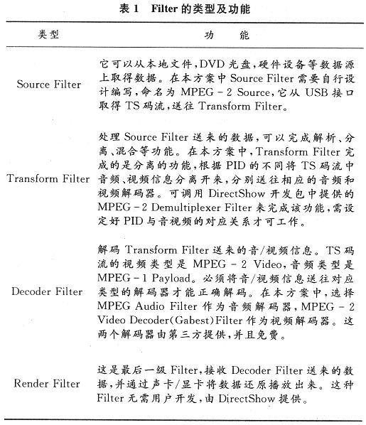 軟件方面,PC機(jī)端應(yīng)用程序的核心部分是實(shí)時(shí)播放器,需要播放的是TS碼流,這是MPEG-2標(biāo)準(zhǔn)定義的一種碼流。本方案采用基于DirectShow技術(shù)搭建的媒體播放器。DirectShow是DirectX家族中的成員,它為在Windows平臺(tái)上處理各種格式的多媒體文件的回放、音視頻采集等高性能要求的多媒體應(yīng)用提供了完整的解決方案,重要的是它很好地支持了MPEG-2標(biāo)準(zhǔn),它使應(yīng)用程序開發(fā)人員從復(fù)雜的數(shù)據(jù)傳輸、硬件差異、同步性等工作解脫出來,總體應(yīng)用框架和底層工作由DirectShow來完成,大大加快了開發(fā)進(jìn)度。
