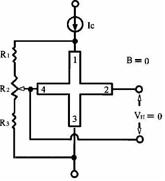 圖2系表示3~5端子之霍爾組件的使用方法,在三端子霍爾元件之輸出可以產生輸入端子電壓之大致一半與輸出信號電壓之和的電壓,而在四端子及五端子霍爾組件中,在原理上雖然可以免除輸入端子電壓的影響,但實際上即使在無磁場時,也有起因于組件形狀之不平衡等因素之不平衡電壓存在。