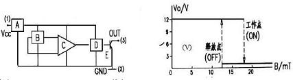 開關型霍爾集成電路可在一定范圍的磁場中獲得ON-OFF的電壓,此開關型對磁場的磁滯(Hysteresis)現象,乃是為使開關動作更為霍爾集成電路線性型確實起見而故意如此設計的。