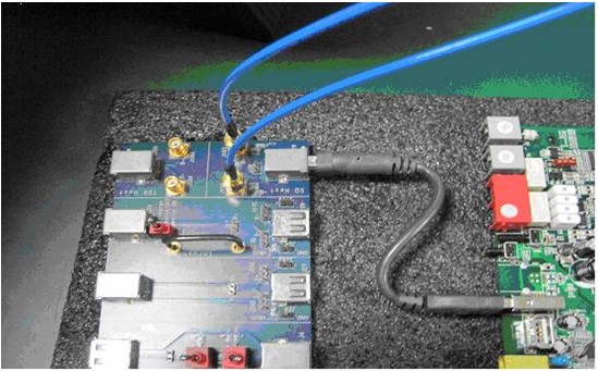 在和客戶方面的資深工程師分析和討論之后,我們有了一個非常巧妙的解決方案,當然還需要實際的測試來驗證。USB專業測試人員都知道,USB IF針對USB一致性測試提供了一個專用測試工具 (USB-IF HS Electrical Test Tool)以方便開發者進行相關的USB測試。但這個工具只能運行在PC主機上,而我們的嵌入式系統其實也是通過相應的底層命令來實現這個工具相關的測試功能。從測試拓撲來看,我們目前的問題主要在于嵌入式控制主機無法實現對USB Hub的控制和測試模式設定。從控制系統的角度來說,不管是嵌入式控制主機還是PC主機都實現的是USB主機控制器的作用,也就是說我們可以使用PC主機替代嵌入式控制主機,在一臺裝有USB-IF HS Electrical Test Tool的PC上對產品板級USB Hub進行Down Stream Facing Port的Test Packet測試了。當然,我們首先要斷開嵌入式控制主機與USB Hub之間的Up Stream Facing Port并飛線與PC主機的USB接口連接。因為測試單扳本身提供5V供電,所以我們只需要飛出D+/D-/GND三線即可。完成后的圖示如下: