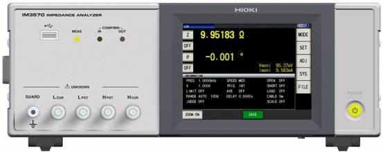 即將發售的阻抗分析儀IM3570是測量頻率4Hz~5MHz,測試電平5mV~5V的LCR電橋與阻抗分析儀合二為一的儀器。因為對應不同測量條件都能高速連續測量,所以在需要使用眾多儀器檢查的生產線上,僅IM3570一臺便可實現。
