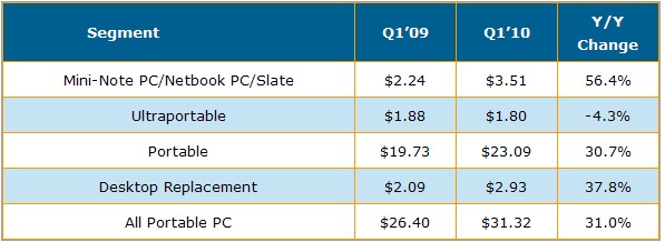 根據DisplaySearch最新調查結果表示,2010年第一季度筆記本電腦出貨金額達311億美金,這是自2008年第三季以來最高單季出貨紀錄,當時筆記本電腦均價較目前高出20%。除了取代臺式電腦的筆記本電腦(Desktop Replacement)均價下降外,其它應用領域如上網本/平板電腦(netbook PC/ slate),與超可攜式電腦(ultraportable)均價均有兩位數的增長。