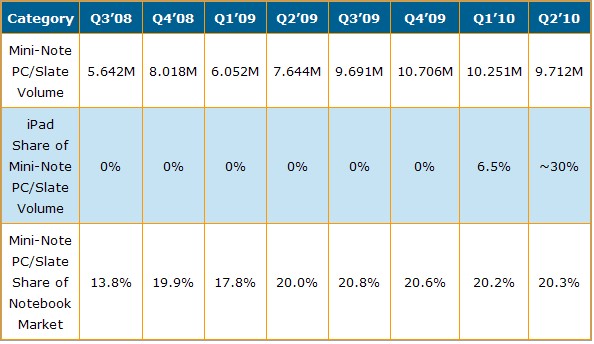 表二:Q3’08-Q2’10上網本與平板電腦出貨量及市場份額(單位:百萬臺)