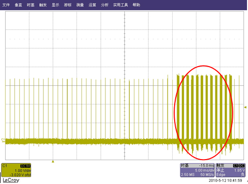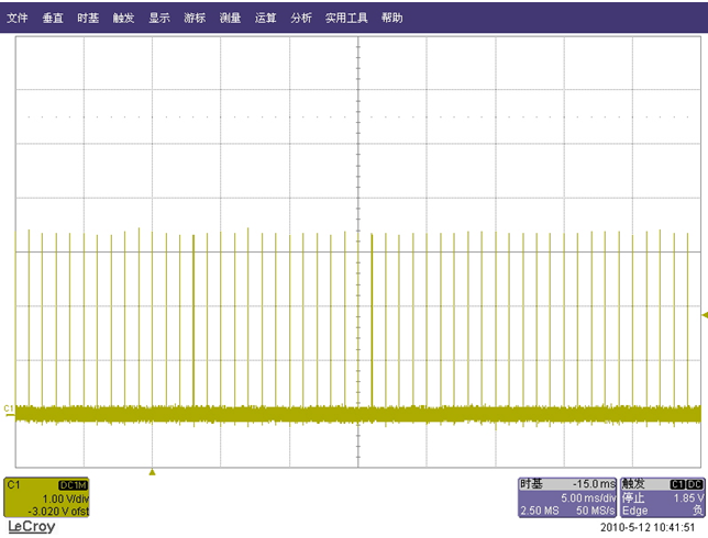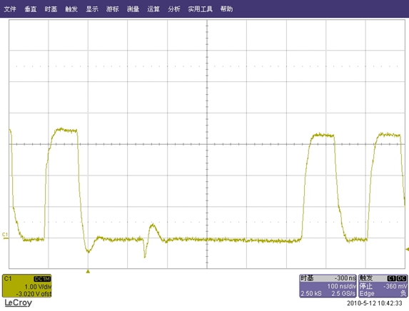 而且這個(gè)“飛鳥”和林中的“鳥”相比較很多特點(diǎn)差不多,用什么邊沿、脈寬、邏輯等觸發(fā)還拿它沒(méi)辦法;正一籌莫展之際,仔細(xì)觀察圖二,終于找到這個(gè)“飛鳥”的弱點(diǎn),正常的波形沒(méi)過(guò)沖,而數(shù)據(jù)量突發(fā)增大的波形有,不過(guò)它跟我們經(jīng)常見(jiàn)到的出現(xiàn)在波形上方的過(guò)沖有點(diǎn)差別(而我們往往習(xí)慣于在0軸上方找觸發(fā)點(diǎn)、設(shè)置觸發(fā)電平),它出現(xiàn)在0軸的下面,正因?yàn)檫@點(diǎn)差點(diǎn)讓它“飛”走了,弱點(diǎn)找到就好辦了,我們把觸發(fā)電平設(shè)置在0軸下面的過(guò)沖上,并按下normal或single的觸發(fā)模式,“鳥兒”很容易就抓到了: