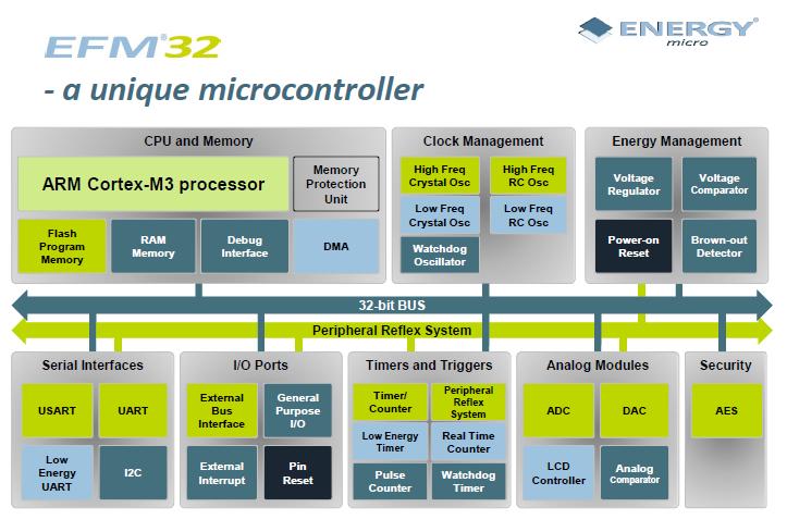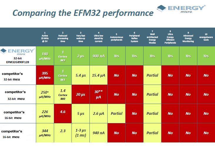 圍繞節(jié)能的ARM ® Cortex™- M3處理器架構(gòu),Giant Gecko, Gecko 和Tiny Gecko微控制器的使用證明它們可比競(jìng)爭(zhēng)對(duì)手的8 - ,16 - 或32位微控制器節(jié)能四分之一。 這些微控制器具有僅為2μs的喚醒時(shí)間和MHz執(zhí)行代碼下每閃存180μA的電流消耗,深度睡眠模式下為900nA,關(guān)閉模式下為20nA,這些微控制器被證明有能力延長(zhǎng)300%的標(biāo)準(zhǔn)電池壽命。