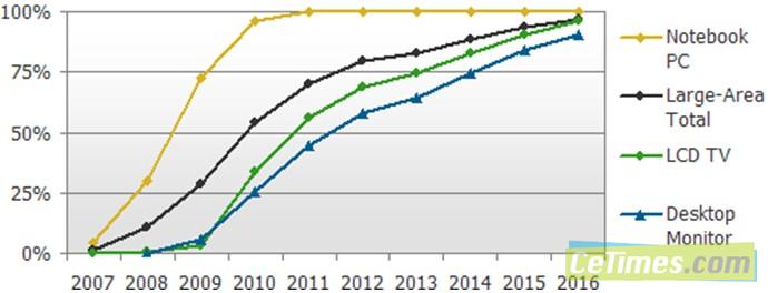 圖一:2007-2016 LED背光源面板在10寸以上液晶面板滲透率(按不同應用別)