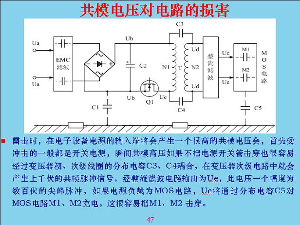 下面講一下共模電壓對電路的損害。其實共模電壓對開關(guān)電容前面的影響不是很大,最大是后面一點,通過電壓器分布電路,以前的模式電路電壓用得很低,都是1v-5v左右,納米級容易擊穿,電容也相當小。從里面串進去的電壓經(jīng)過濾波不斷的吸收降下來,一般有上千伏,容易把后面的擊穿。在實踐過程中為了防雷,這幾個位置最好在上面布一個雷點電容,對防雷電擊穿很有效。共模電壓進去以后瞬間擊穿,如果電子沒斷開,外面的電流會繼續(xù)延續(xù)下去把它燒掉,如果備一個電容上去,共模電容通過電容一下子把它吸收掉,讓幾個電容互相通電位,幾個模組不會那么容易擊穿。