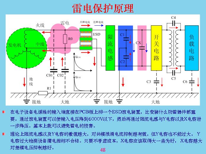 大家想想看,跟前面我們所說的,感應(yīng)雷這個東西沒有一個標準的概念說什么叫做感應(yīng)雷。只要打雷的話,外面打雷,窗戶上面的金屬,如果夜間都可以看到放電產(chǎn)生火花,這就是通過電磁感應(yīng)產(chǎn)生的位移電流原理。從原理上來說,三相四線或三相五線,發(fā)電機有中線接地,設(shè)備使用者的外殼接地是最有效的避雷方法,但現(xiàn)在很多設(shè)備都不接地,沒有辦法接,只有很貴重的進口設(shè)備用三相電源,中間那一條地線,地線不是中線,大家要搞清楚。中線雖然是接地的,但在這里不能當成地線,地線一定是自己大樓本身的地,而且要量好接地的地線。因為地線接進去以后,大樓對外面的電磁層進行屏蔽了,大樓相對來說也是導(dǎo)電的,就算不導(dǎo)電,現(xiàn)在國家都有安全要求,大樓超過多少層都要加上避雷針,就是防雷的。如果不能接地,你就要考慮充放電的問題。前面最好的共模電容我覺得還是要,我認為這個共模電容最好連接上,不能接大地,要接在外殼上,接到外殼上有什么好處?共模電壓一進來,雖然電流沒有通過地放電回路,把電壓舉高起來了,與外面輸入電壓是一樣的,外殼電壓取的一樣,起到了屏蔽作用。如果這個接地的話會更加安全,但是地線要足夠粗,回路也足夠,因為放電的電流很大,很容易燒掉。這幾個東西是經(jīng)過很多年的試驗,8是很成熟的東西,不管做共模還是防雷都要做上,如果連機殼都沒有,只是塑料殼,也要考慮這根線接到什么位置最好?是接到里面面積最大的地方,就是公共地面積最大的地方,讓電位舉起來,其他電位差不會產(chǎn)生很大的電容回路。主要是考慮充放電回路,電流越小越好,兩個電位差越小越好。