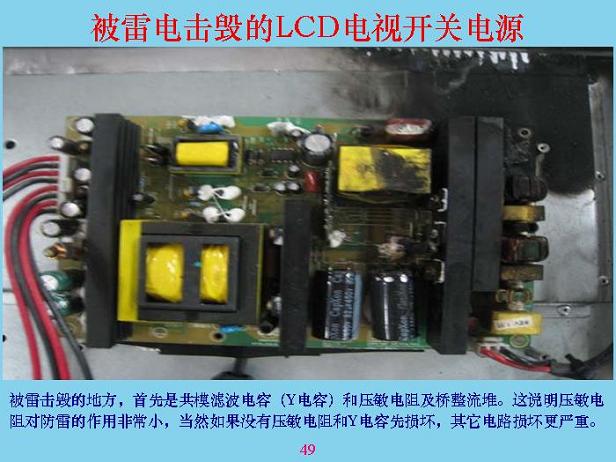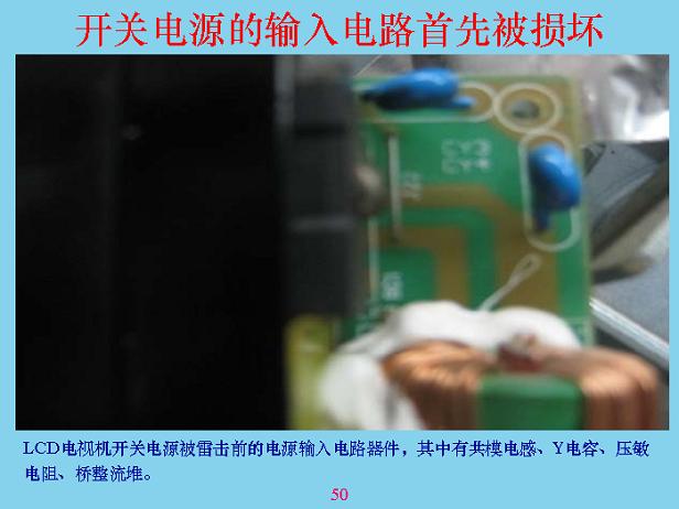 下面我們講一些具體的。這是一個開關(guān)電源,開關(guān)電源被雷劈的時候,輸入回路基本上都燒了,假如沒燒是什么樣的?可以看看,這是橋堆,這兩個是Y電容,這里面還有一個壓敏電阻。這是共模線圈,雷劈以后全部燒了,說明壓敏電阻沒有起到什么保護作用,兩個電容都燒了,說明電感相當、相當?shù)馗摺榱朔乐估纂姡紫惹懊嬉欢ㄒ右粋€能量吸收,比較大的東西,成本相對來說比較低,像試驗站里面的放電裝置,那個東西沒有地方裝,也貴得很。在硬紙板上面排幾個鋸齒,中間隔一個頭就行了。如果中間隔6mm也可以。有一個一級電感,電感可以使瞬間上去很快的電壓降下來,突然加一個1萬伏、10萬伏,加上去只有這兩端,另外兩端建立不起來,所以剛加進去的時候?qū)纂妬碚f,大部分能量都被吸收掉了。后面經(jīng)過這個以后,剩余部分通過共膜電容繼續(xù)吸收,吸收完以后還有差模部分,產(chǎn)生的差模部分通過電容把差模吸收掉。共模電容和差模電容具有抑制傳導(dǎo)干擾的作用,對雷電也有抑制作用,所以很多人也在問,電容接到前面好還是接在后面好?這個東西看你有什么作用,如果只是為了防EMI電磁干擾的話,接在越前面越好,接在測試儀表的輸入端最好,接到那里把信號全部短路掉了,就看不到了。但是對于雷電,你接到后面要好很多,所以這主要是防雷的,你就不要考慮電磁干擾和EMC了,盡量把兩個放在后面。