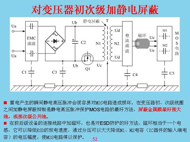 對于一些比較貴重的儀器、設(shè)備,在開關(guān)電容電壓器這里最好做靜電比例,在初次級線圈中間做一個鋁箔片都可以,包一層,這層不能短路,短路的話變壓器就會燒掉,包在外面可以短路,包在里面不能短路,包在外面吸收漏電電感,包在里面的主回路里面會短路,然后把它進行接地,這相當于可以隔離掉。這個有一個教訓(xùn),前段時間康佳臺灣裝LCD屏測試,打了一個隔離變壓器,后面就是接測試儀表,每個月都有一臺、兩臺測試儀表損壞,查不出原因,最后讓他們把隔離變壓器的中間屏蔽才好。屏蔽以后,進一步有機會的話,在接頭有連接的地方加一個磁環(huán),讓共模電壓將磁環(huán)速度放慢,緩沖一下,讓瞬間能量降低,瞬間能量緩慢一點,慢慢的過,損傷就會少很多。所有電路都可以把它看成一個分布電流,只要某地方電壓電位在改變,對后面都會產(chǎn)生充放電,從這上面理解就知道了,如果哪個地方構(gòu)成回路,如果有一個高電壓進來一直傳導(dǎo)到后面,最后充電,充電可以理解成分布電容,如果沒有這個也有一個分布電容在里面,把分布電容放在這里,就比較形象地。就像以前的絕緣長效濾管一樣,手一摸沒有造成回路也壞掉了,絕緣的濾管很容易壞,一從里面拿出來,手一摸就壞掉,一個身上面帶正電,或者你作為天線有感應(yīng)電壓,感應(yīng)一下來回充放電就壞掉了。