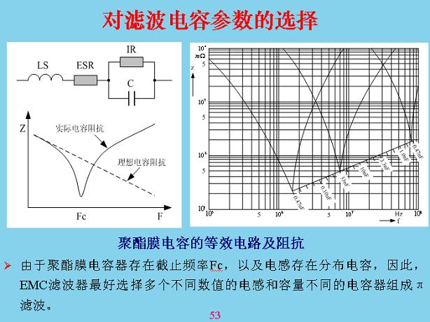 對于濾波電容,大家注意前面的EMC濾波,這個電容不是理想電容,里面有一個電感,還有漏電電阻,里面有串聯(lián)電阻,電感和電容有沒有產(chǎn)生串聯(lián)諧振?曲線是這樣一條斜線,串聯(lián)諧振相當于把信號短路掉了,信號短路的阻礙很大,這里面有一個最佳值,然后成為感線,進行EMC電路設(shè)計的時候最好用不同的電容進行配模,這是0.4的曲線,33nF并聯(lián)就可以保證在上面不是好的,單獨一個電容后面覆蓋不到,以后有機會我講這些元器件,你們在大學(xué)里面學(xué)的是符號,對電阻電容基本是不懂的,還有電組電容這方面的問題最多,還有電容,電容來回極化的時候,速度跟不上外面的變化,會損耗相當大,會燒壞,特別是脈壓電容,很多人認為體積越小越好,但沒有考慮在開關(guān)上容易出現(xiàn)問題。