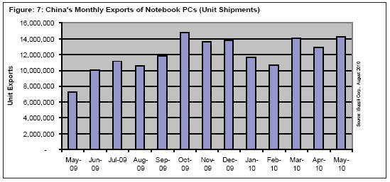 據iSuppli公司,由于第二季度全球對筆記本電腦的需求強勁,中國5月筆記本電腦出口量創下紀錄高位,幾乎是2009年5月的兩倍。