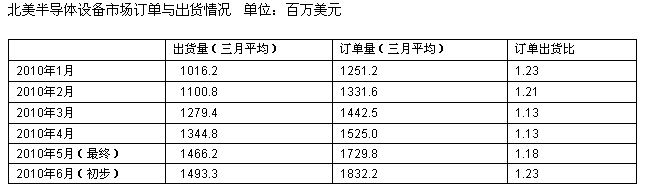 SEMI日前公布了2010年7月份北美半導(dǎo)體設(shè)備制造商訂單出貨比報(bào)告。按三個(gè)月移動(dòng)平均額統(tǒng)計(jì),7月份北美半導(dǎo)體設(shè)備制造商訂單額為18.3億美元,訂單出貨比為1.23。訂單出貨比為1.23意味著該月每出貨價(jià)值100美元的產(chǎn)品可獲得價(jià)值123美元的訂單。