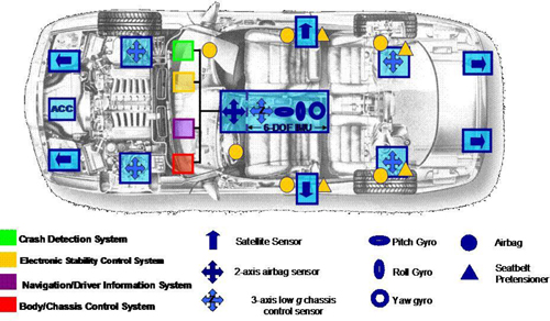 在汽車的主動與被動安全保護領域,市場趨勢主要包括以下幾個方面:首先,傳感器趨于整合,例如將ESP與安全氣囊放置在同一ECU之內;其次,傳感器的界面將趨于標準化,其中包括數字界面,SPI、DSI以及PSI5。目前,市場上PSI5的采用率要高于DSI;第三,市場上對高性能陀螺儀的需求將逐漸增多,尤其是配有高級駕駛輔助系統如ACC的汽車;第四,中國和印度等國家已經在司法層面上做出規定,要求所有汽車100%裝有安全氣囊; 第五、歐洲國家也頒布了有關行人保護的法規,車載衛星導航將成為主要趨勢,因此正面撞擊傳感器將成為主要的解決方案。