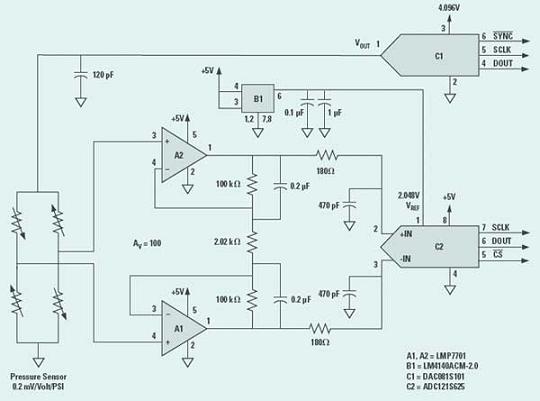 上例電路的液壓傳感器屬于電阻性電橋,傳感器的輸出取決于電阻值的變動及驅動電阻的電壓,并與兩者有函數上的關系。圖3所示的傳感器具有0.2mV/V的敏感度。DAC081S101是一款8位的數字/模擬轉換器,可以改變驅動電橋的電壓,以便為液壓測量電路提供增益控制。例如,數字/模擬轉換器輸出若設定為4V,那么全標度液壓便可達25.6PSI。若輸出電壓為1V,全標度液壓便高達102PSI。
