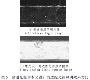 基于以上條件,本文設計了專用于PCB厚密板的適配環形光源,為考核光源的實際效果,將光源和鏡頭對準PCB上同一區域。鏡頭倍率也調節至相等。采集到如圖5所示的對比圖像。