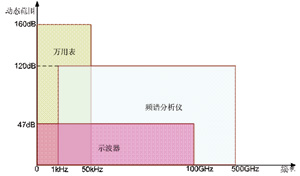 假定黑盒內部的電路和信號輸入均正常,如果黑盒的輸出仍然有問題,這時就應該重點排查電源輸入。常用的電源檢測儀器有示波器、頻譜儀和數字萬用表,它們能夠覆蓋的測量范圍不同(如圖2所示),應該綜合運用這些儀器來全面觀察電源信號,避免測試盲區。