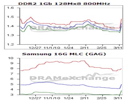 從DDR3來看,市場已經聞風而動,顆粒價格有明顯上升的勢頭,尤其是金士頓內存(見下表),未來一段時間內價格有可能繼續上揚。一些經銷商預計閃存價格地震后將出現15%以上的漲幅,已經開始小幅提價,并出現了惜售的心態。目前甚至不排除部分經銷商囤貨了。