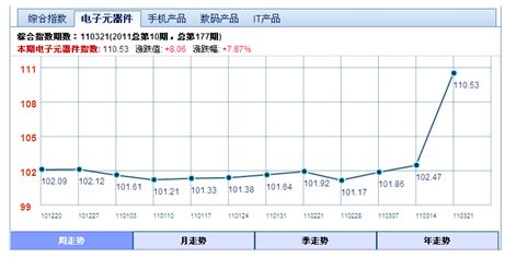 需要特別指出的是,四大成分指數之一的電子元器件指數的漲幅最為明顯,本期指數從3月14日的102.47點,漲到了110.53點,漲幅為7.87%,也是3年來之最。看來,日本地震對華強北指數的影響也是達到了峰值,也充分說明,華強北電子元器件市場已經受到了日本地震的強烈沖擊。
