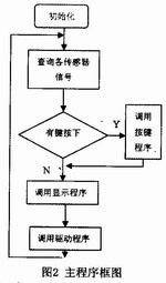 主程序的主要功能是循環(huán)調用顯示子程序、按鍵子程序,查詢各輸入信號狀態(tài),根據按鍵設定的各種參數和各輸入信號狀態(tài)控制各執(zhí)行機構,完成對PCB周轉箱托架系統的傳動控制,以及對PCB板的有序傳送,判別系統運行狀態(tài)是否異常,并及時報警或解除報警。主程序框圖如圖2所示。