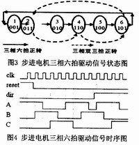 驅動子程序主要負責生成步進電機驅動器所需要的信號。當上行鍵或下行鍵按下,或者根據主程序運行結果,需要提升或降落周轉箱托架,主程序會調用步進電機驅動子程序。步進電機采用三相六拍工作方式,根據絲杠付螺紋間距,計算出步進電機每步進程,再根據周轉箱板間距,確定不同工況下,步進電機的正/反轉步數,這些步數保存在各相應存貯器里,供主程序調用驅動子程序時使用。圖3和圖4分別為步進電機三相六拍工作方式時驅動信號的狀態(tài)圖和時序圖。