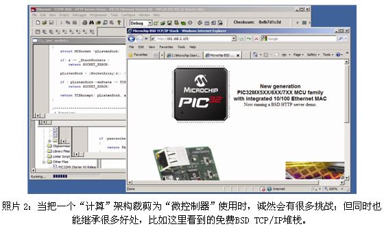 多年來(lái)Microchip 一直在為其小型的PIC 芯片提供部分網(wǎng)絡(luò)軟件棧,PIC32 做得更多,它提供了全功能、免費(fèi)的BSD TCP/IP 網(wǎng)絡(luò)堆棧。包含所有的網(wǎng)絡(luò)服務(wù)、套接字等,以及這些常用的協(xié)議:DHCP、UDP、ICMP、ARR 等。''795 型芯片中有512KB 的片上flash,有充足的空間存儲(chǔ)一些漂亮的演示程序,讓我們?yōu)g覽一下入門(mén)電路板(見(jiàn)照片2)。