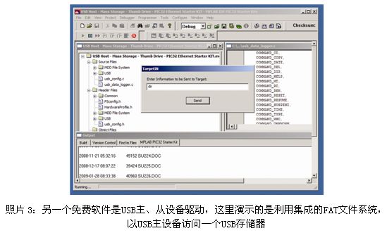 這個(gè)套件包含了一些實(shí)用的演示。其中一個(gè)演示讓該板子成為一個(gè)標(biāo)準(zhǔn)人機(jī)接口設(shè)備(HID)——比如鼠標(biāo)。因?yàn)镠ID 驅(qū)動(dòng)已經(jīng)是標(biāo)準(zhǔn),你可以把它直接插入PC 使用。另外,你可以把這個(gè)套件配置成USB 主設(shè)備,從而利用PIC32 不斷完善的FAT 文件管理軟件庫(kù),有一些演示展示了如何訪問(wèn)廣泛使用的USB 存儲(chǔ)器(見(jiàn)照片3)。