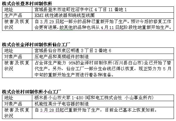 村田株式會社關于三個受災工廠的恢復情況