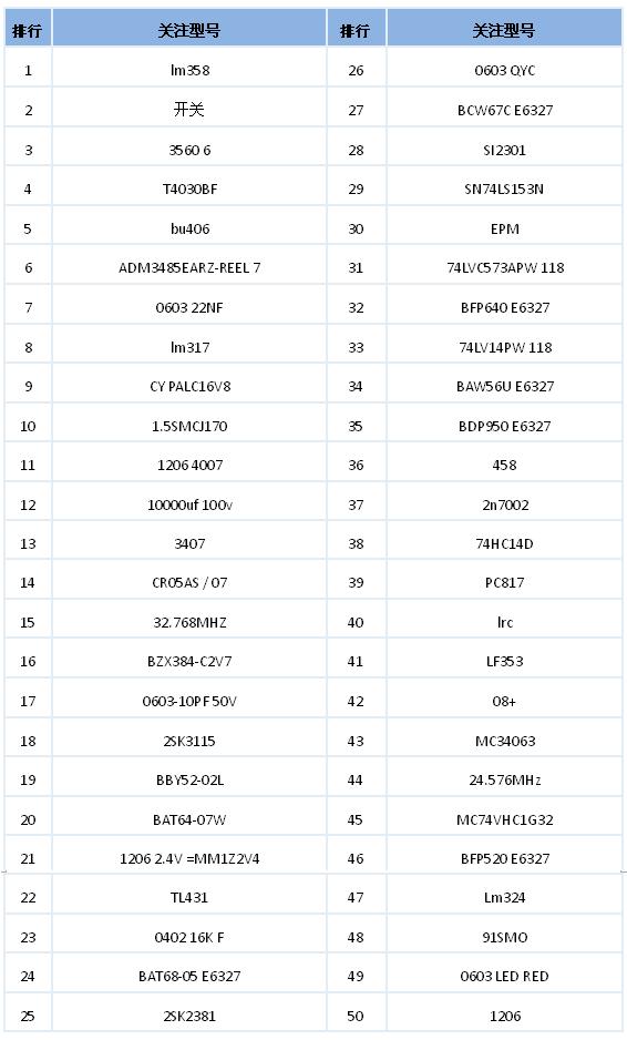 • 過去一周商家關注的IC型號排行榜top50一覽