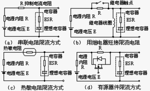遠(yuǎn)遠(yuǎn)高于鋁聚合物電解電容器的紋波電流承受能力。必須考慮上電過程的沖擊電流限制。可以采用AC/DC變換器上電電流限制方法,如串聯(lián)限流電阻,見圖2(a),則: