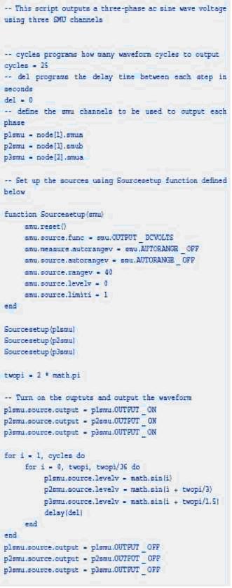 這部分包含許多腳本例子說明吉時利支持腳本的儀器的一些特點。圖1示出了兩臺吉時利系統源表如何使用單腳本控制產生3相交流波形。在這個例子中,使用吉時利的TSP-Link技術連接這兩臺儀器,因而很容易用腳本控制這兩臺儀器。